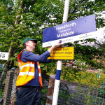 Network Rail have kindly donated sleepers to FoHS, to be used in the Rotary Garden and elsewhere. Here you see several sleepers having just been delivered, awaiting mounting at the station to serve as a frame for displaying a 1950s BR running-in board.