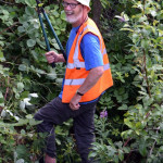 Ian Ball enjoying himself with a shrub on Monday 8 April 2019. This type of work is typical of a Work Party, and aims to make the station a more attractive and welcoming place.