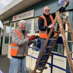 FoHS Treasurer Ian Ball (left) and Chair Andrew Backhouse (right) cheerfully planting shrubs in the April sunshine. This is towards the southern end of the Crewe-bound platform, and is well positioned to welcome arriving passengers from the south and bid farewell to departing passengers heading south.
