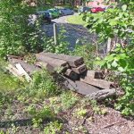 Network Rail have kindly donated sleepers to FoHS, to be used in the Rotary Garden and elsewhere. Here you see several sleepers having just been delivered, awaiting mounting at the station to serve as a frame for displaying a 1950s BR running-in board.